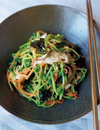 冷凍うどん2玉は袋から出し、さっとぬらして耐熱皿に並べる。ラップをかけ、うどん全体が熱くなるまで電子レンジ(600W)で7~8分加熱する(凍ったままの部分が残ったら、10秒ずつ追加する)。
