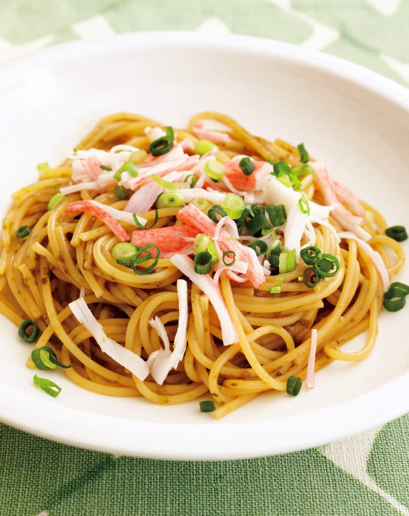 - 3【1】のスパゲティをざるに上げて湯をきる(ゆで汁はとっておく)。ソースのボールに入れ、ゆで汁大さじ1くらいを加えて全体をよくあえる。器に盛り、かに風味かまぼこ、万能ねぎを散らす。