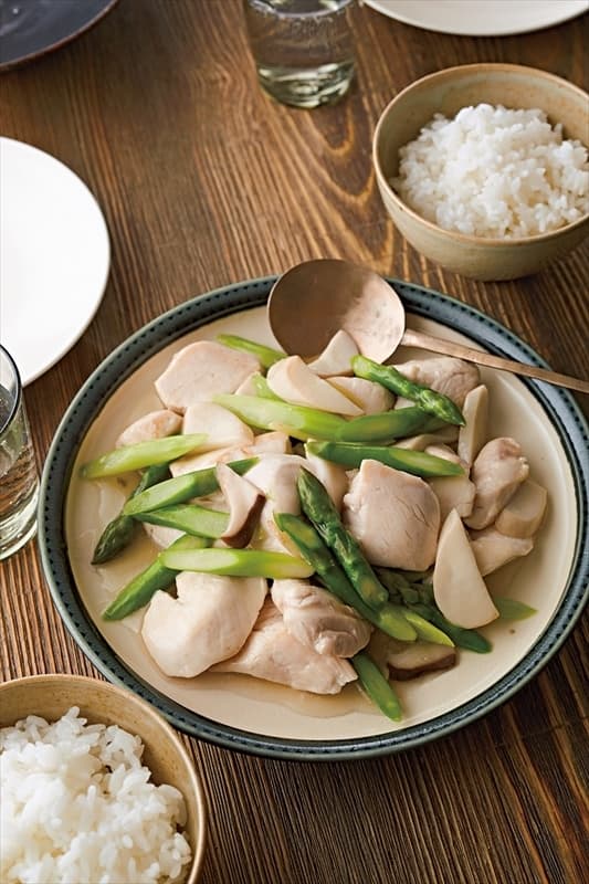 しょうがをきかせた塩味で、風味豊かなアスパラのおいしさを存分に楽しみます。鶏胸肉は炒めすぎないことが、しっとり仕上げるコツ。
