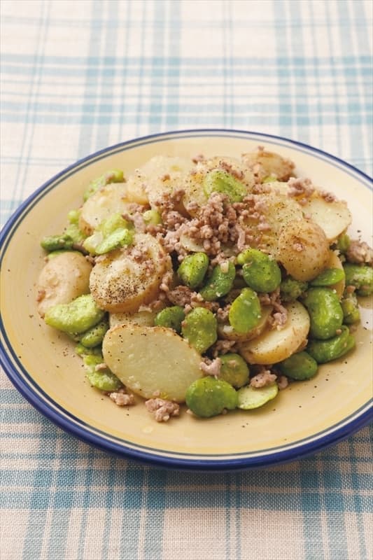 - 2フライパンにオリーブオイル大さじ1を入れ、じゃがいもを並べ入れる。そら豆、にんにくを全体に広げてのせ、酒大さじ2、塩小さじ1/2、こしょう少々をふる。ふたをして、弱めの中火で5分ほど蒸し煮にし、中火にしてひき肉を加え、3分ほど炒め合わせる。粉チーズを加えてさっと炒め、器に盛って、粗びき黒こしょう適宜をふる。