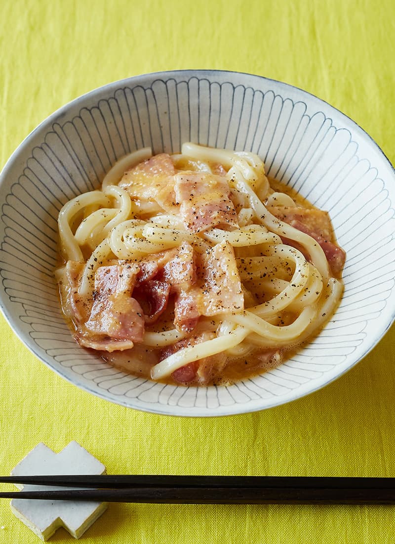 冷凍うどんは袋から出し、耐熱のボールに入れる。ベーコンをのせ、ラップをかけて袋の表示どおりに電子レンジで加熱。