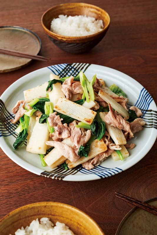 同じフライパンにサラダ油大さじ1/2を中火で熱し、長いもを入れてときどき返しながら7~8分炒める。長いもが透き通ってカリッとしたら、小松菜の茎を加えてひと炒めし、葉も加える。小松菜が少ししんなりしたら豚肉を戻し入れ、炒め合わせる。塩小さじ1/2、こしょう少々で味をととのえる。