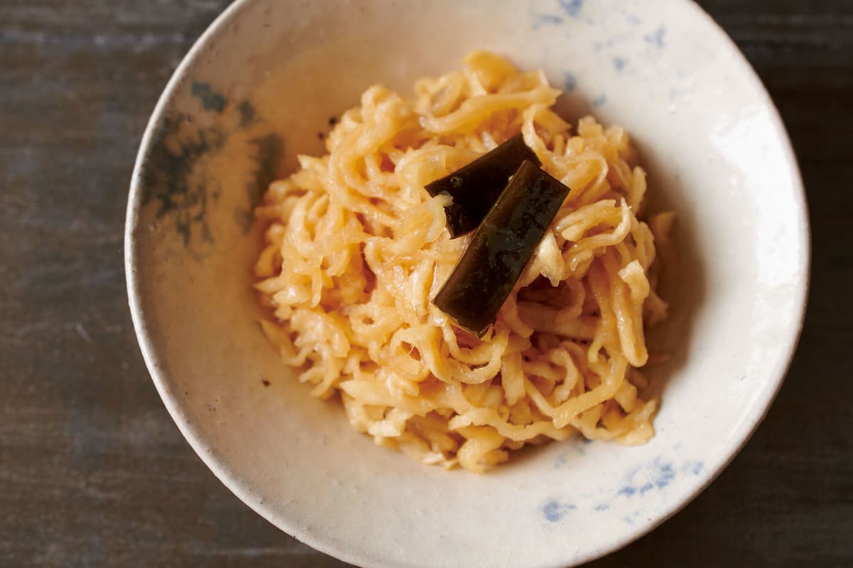 切り干し大根はぬるま湯でさっともどし、食感を生かします。昆布といっしょに漬けて味に奥行きを。