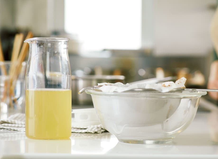 ボールで受けた万能こし器にペーパータオルを敷き、【2】をゆっくり注ぎ入れ、こす。粗熱が取れたら清潔な保存容器に移し、冷蔵庫に入れる。
