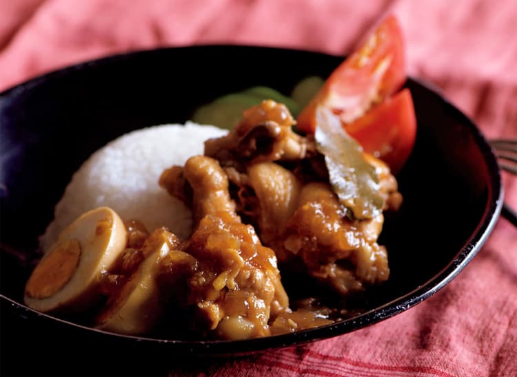 Bを加えて、再び落としぶたをする。鍋のふたをし、弱火で10分ほど煮る。ふたをすべて取り、ゆで卵を加えて火を強める。鍋を揺すり、照りが出るまで煮からめる。ゆで卵は取り出し、縦半分に切る。ご飯を型などに入れ、器に抜く。アドボをかけ、ゆで卵、トマト、きゅうりを添える。