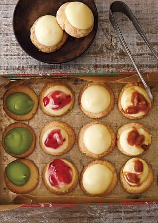 天板ごと取り出し、オーブンを200℃に温めはじめる。クッキーにチーズクリームを等分に手早く絞り出し、200℃のオーブンで1~2分焼く。ケーキクーラーにのせ、粗熱を取る。冷蔵庫で1週間ほど保存可能。