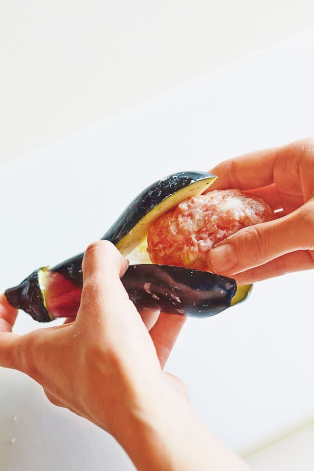 なすの切り込みの内側に片栗粉を薄くまぶし、たねを1/4量ずつはさむ。上からかるく押さえ、切り込みのすきままでたねが詰まるように整える。