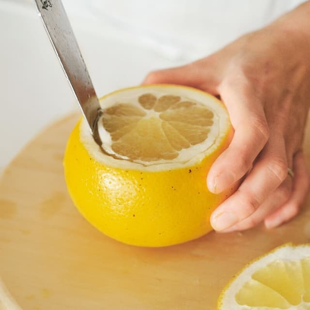 グレープフルーツは上から2cmくらいの部分を切り落とす。皮と果肉の間に包丁でぐるりと切り込みを入れ、果肉をとりやすくする。
