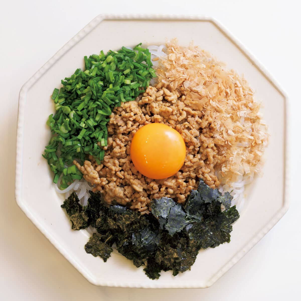 器にしらたきを盛りつけ、【3】、にら、削り節、ちぎったのりをのせ、中央に卵黄をのせる。混ぜながらいただく。