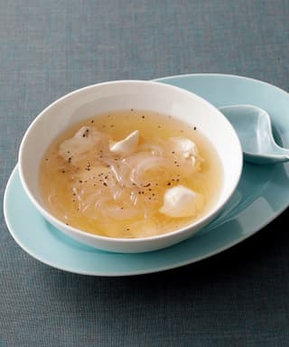湯が沸いたら中火にしてざるを重ね、豚肉を1枚ずつ入れる。もやしを加えて1分ほどゆで、ざるを上げて水けをきる。アクを取ってそうめんを入れ、吹きこぼれない火加減で袋の表示どおりにゆでる。別のざるに上げ、流水でもみ洗いして水けをよくきる。