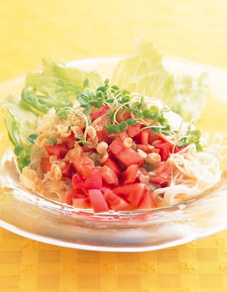 湯が沸いたら、そうめんを入れて、吹きこぼれない火加減で袋の表示どおりにゆでる。ゆで上がる1分前にキャベツを加える。ともにざるに上げ、水けをきる。