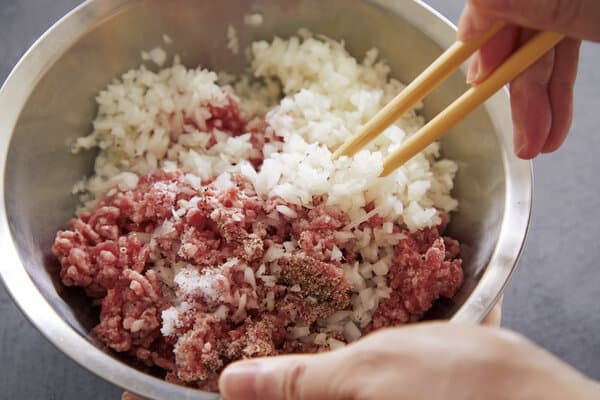 ボールにひき肉、玉ねぎ、塩小さじ3/4、粗びき黒こしょう少々を入れ、菜箸でよく混ぜる。