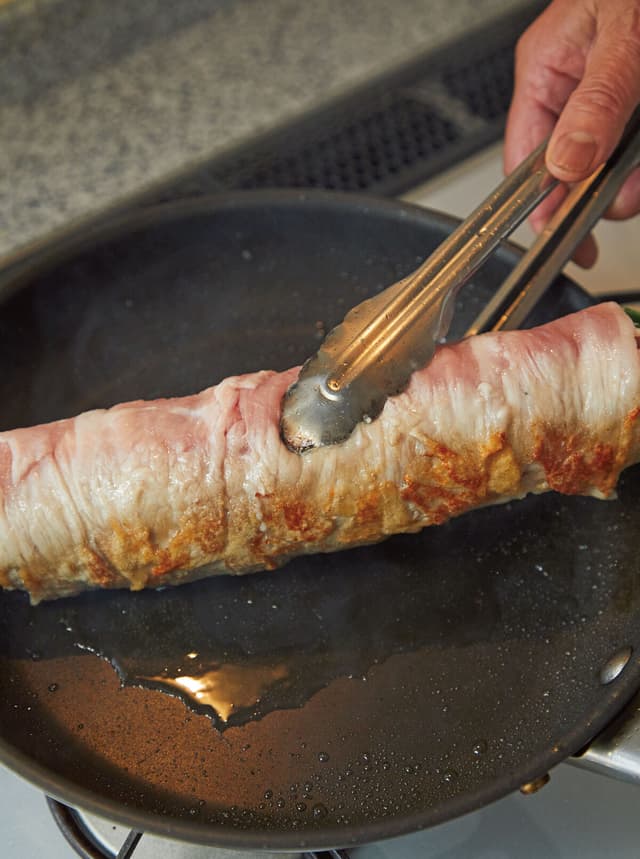 フライパンに油を熱し、肉巻きの巻き終わりを下にして入れる。全体に焼き色がつくようにころがしながら、中火で焼く。ふたをして弱火にし、8~10分蒸し焼きにする。