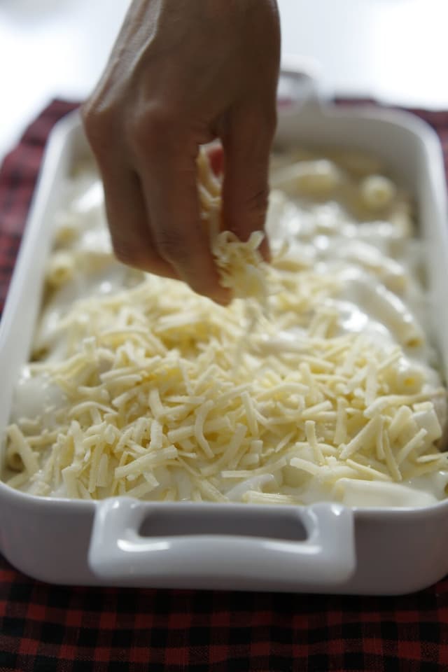 オーブンを220℃に温める。耐熱皿にホワイトソースを少し敷き、マカロニと【2】を入れてならし、残りのホワイトソースをかける。チーズを全体に散らして220℃のオーブンに入れ、15~20分焼く。