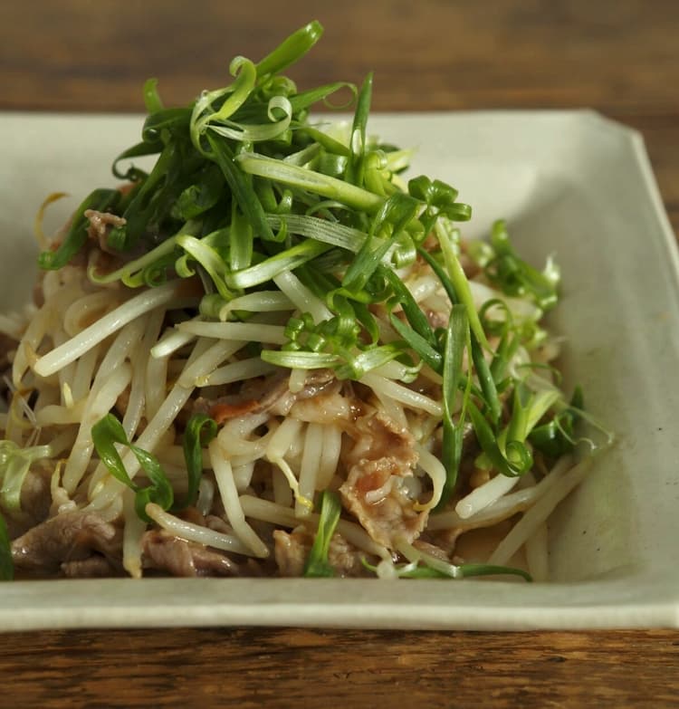 肉は長さ6~7cmに切る。もやしはできればひげ根を除き、たっぷりの水にさらす。万能ねぎは細長い斜め薄切りにし、水にさらす。くるんと丸まったらざるに上げる。