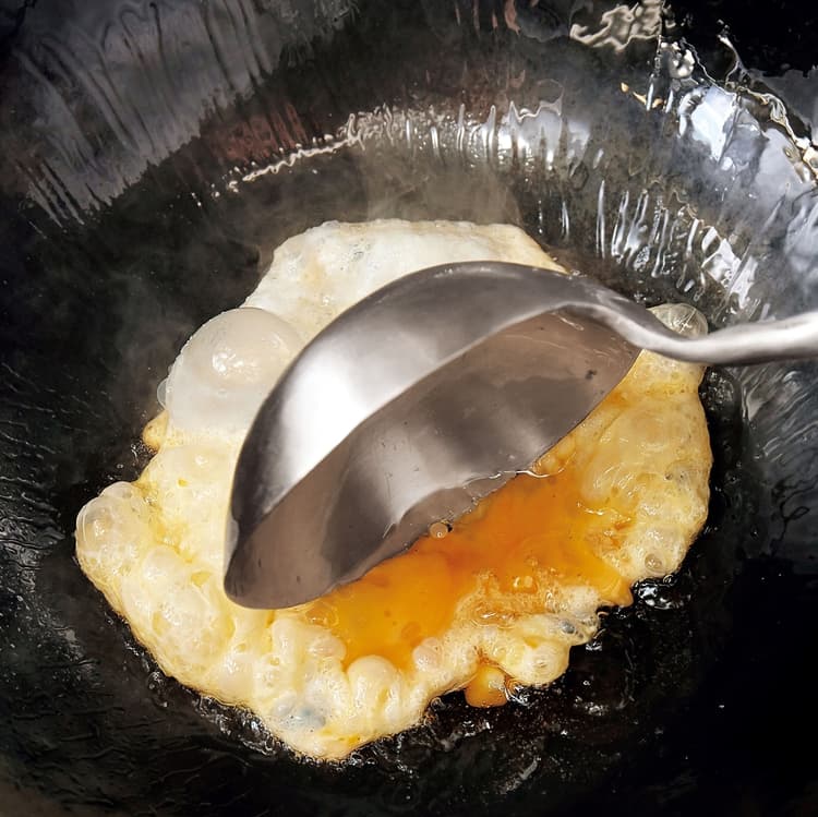 フライパンにサラダ油大さじ2を入れ、強火で1分ほど熱する。卵を回し入れ、そのまま混ぜずにフライパンを揺すって手早く広げる。木べら(店ではおたま)を外側から内側に大きく2~3回動かして混ぜ、裏返してすぐに火を止める。へらで3つ~4つに切り、取り出してざるに上げる。