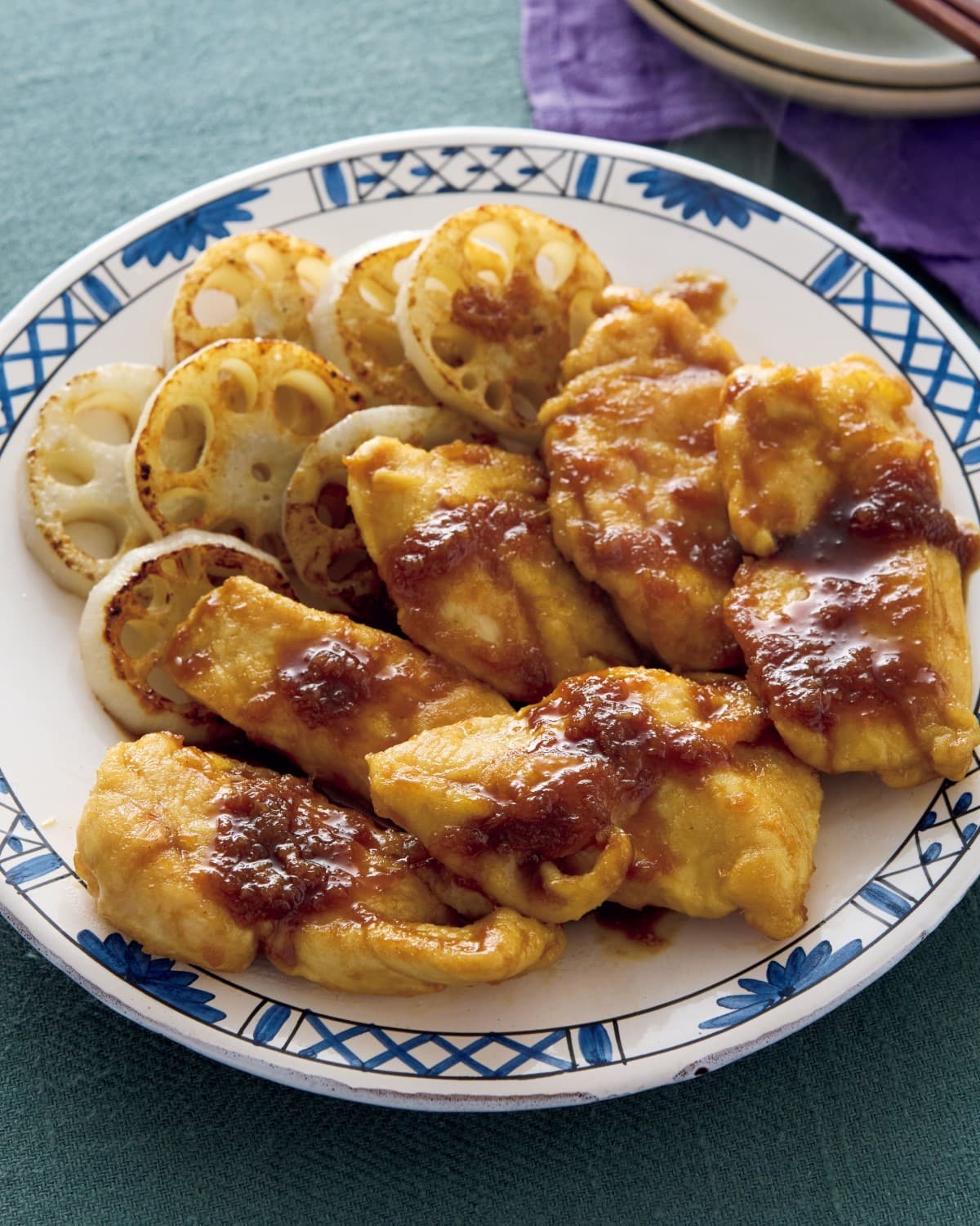 れんこんは皮をむき、幅1cmの輪切りにする。鶏肉は幅1.5cmのそぎ切りにし、塩少々、小麦粉大さじ1をまぶす。Aは混ぜる。