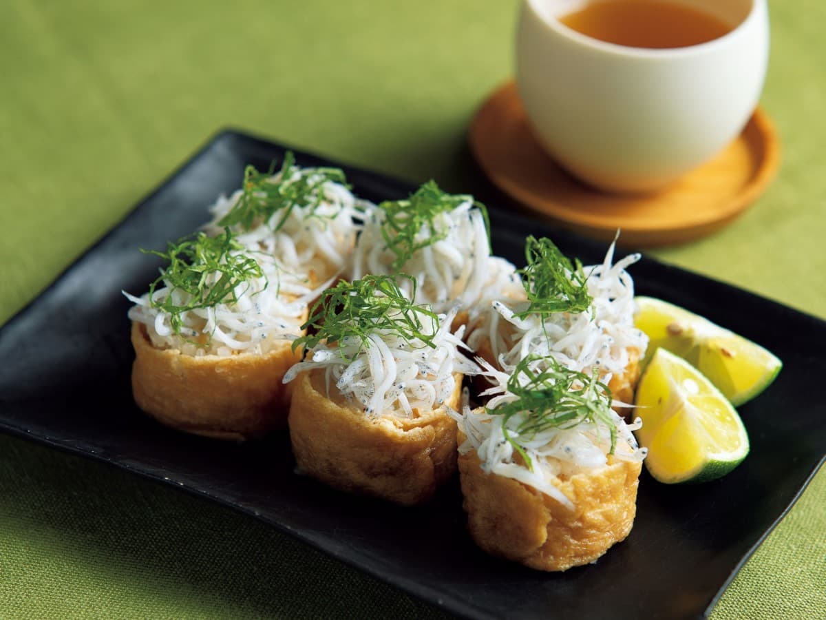 酢めしの部分にしらす、青じそを等分にのせ、すだちを添え、絞っていただく。