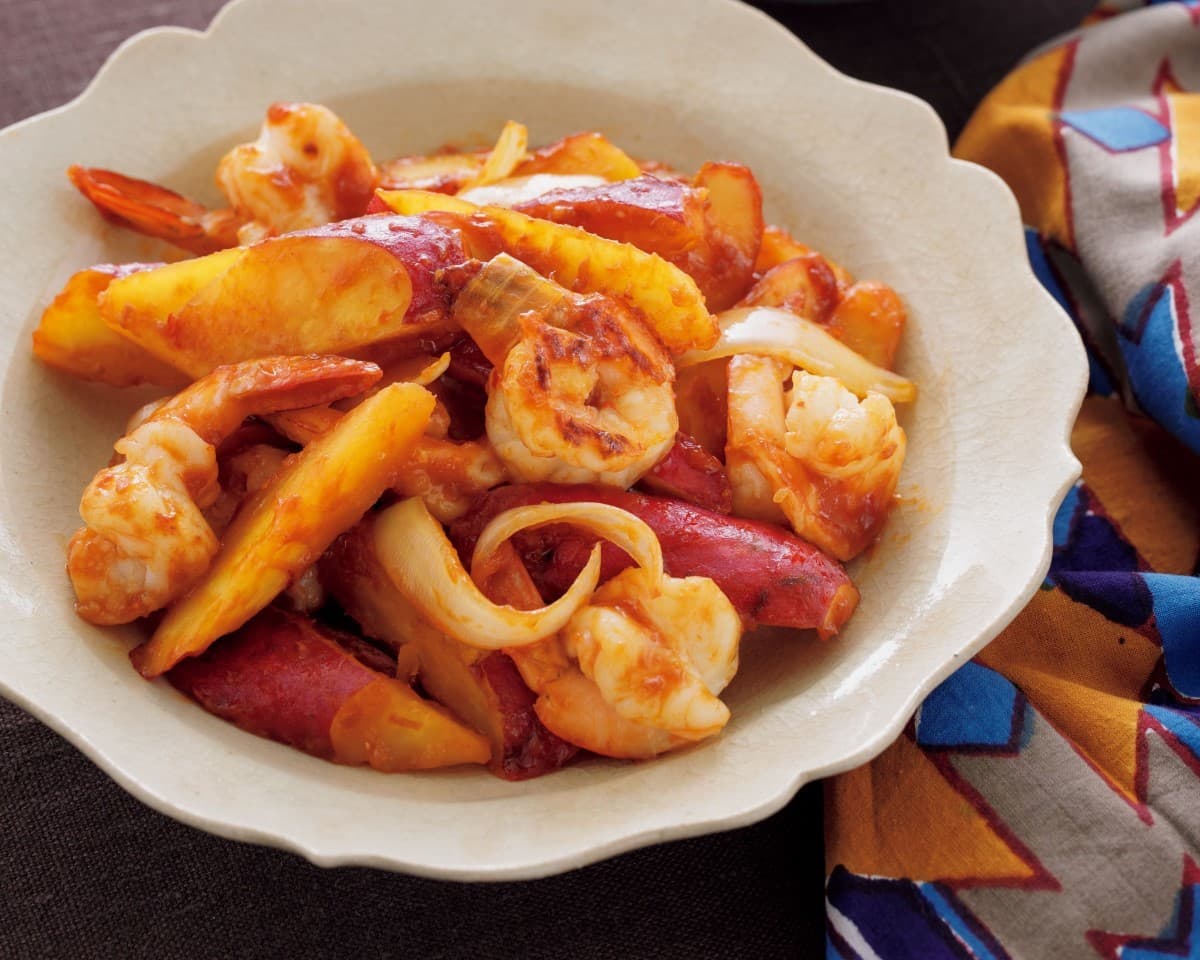 梅干しの酸味を加えたピリ辛ケチャップ味。甘みのあるさつまいもによく合います。