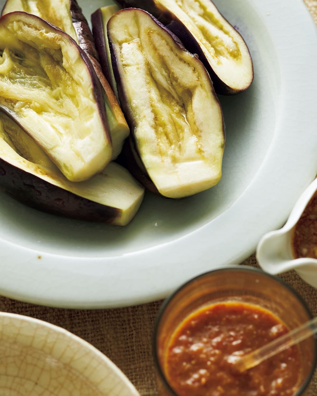 なすはへたを取って縦半分に切る。フライパンに水1カップを入れ、なすを皮目を下にして並べる。中火にかけ、煮立ったらふたをして10分ほど蒸す(途中で水が少なくなったらたす)。皮のほうまで菜箸ですっと裂ければOK。器に盛り、下記の好みのたれをかけていただく。