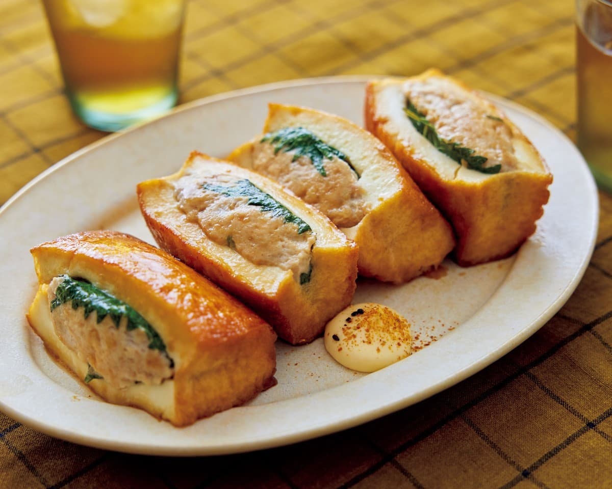 厚揚げは縦半分に切り、切り口の中心に切り込みを入れてポケット状にする。青じそに肉だねを等分にのせ、横半分に折りたたんで厚揚げの切り口に詰める。