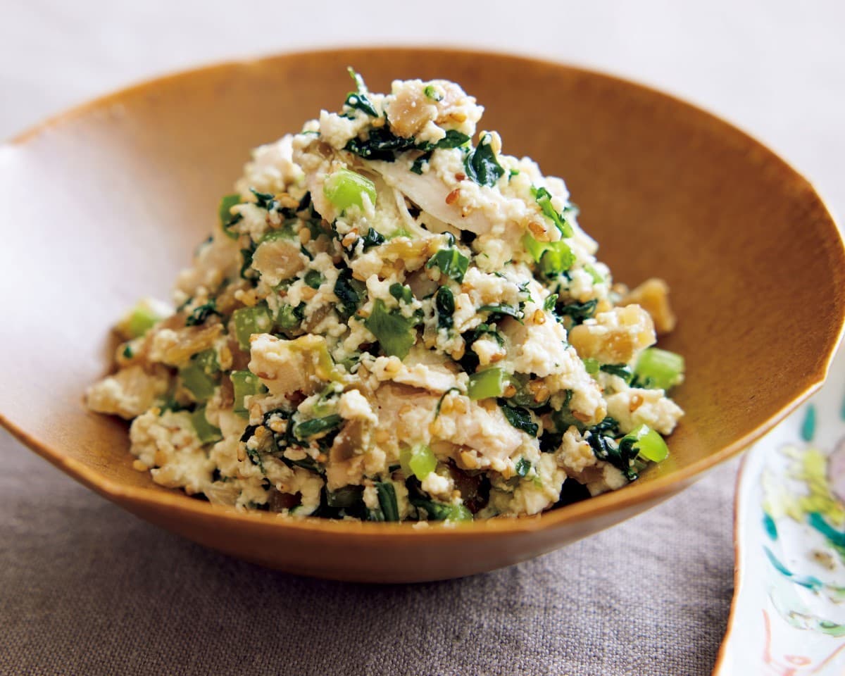 いつもの白あえも、ザーサイが加わることで中華風のひと皿に。小松菜を生で使って新しい食感も楽しんで!