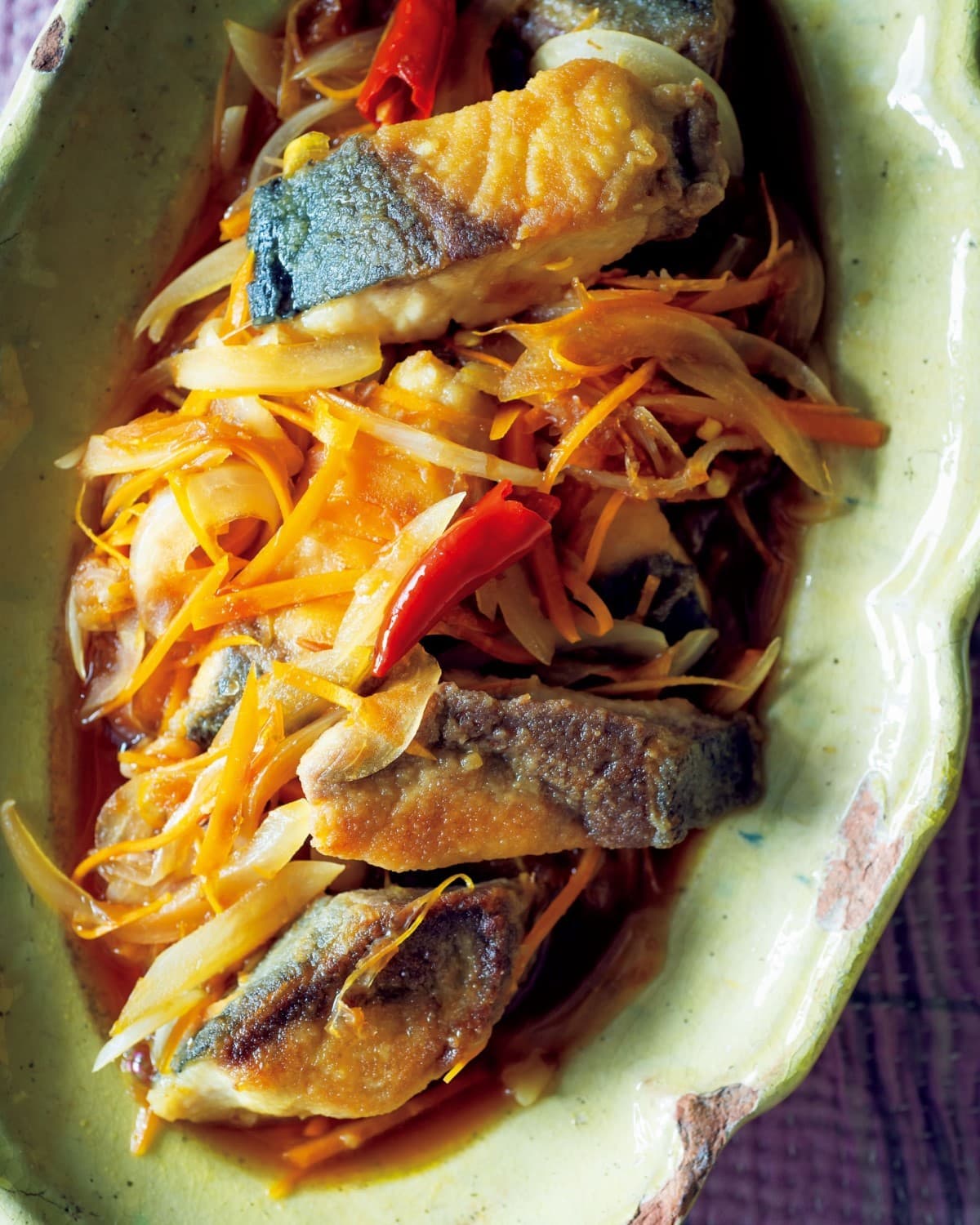 ぶりは骨があれば抜き、塩ひとつまみをふって10分ほどおく。水けを拭いて4等分に切り、小麦粉大さじ1をまんべんなくまぶす。玉ねぎは縦にごく薄切りにする。にんじんは皮をむいてせん切りにする。