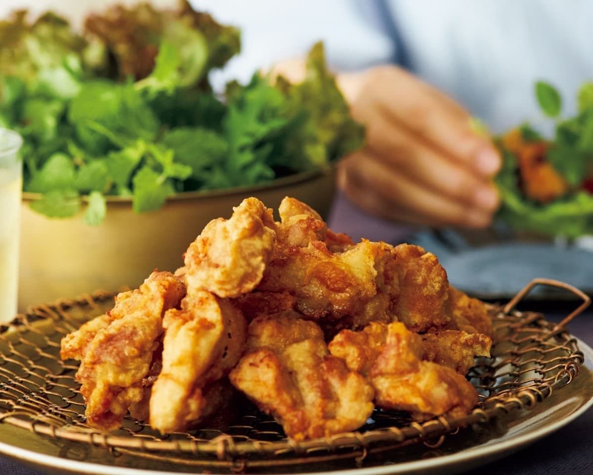 揚げ鍋に油を高さ3cmほど入れ、中温(※1)に熱する。【2】の1/2量を皮目を下にしてのばしながら入れ、3~4分揚げて一度取り出す。3分ほどおいてから揚げ油を高めの中温(※2)に熱し、鶏肉を戻し入れてカリッと揚げ色がつくまで1~2分揚げる。残りも同様に揚げる。器に盛り、葉野菜や香味野菜とたれを添えて、から揚げを巻きながらいただく。