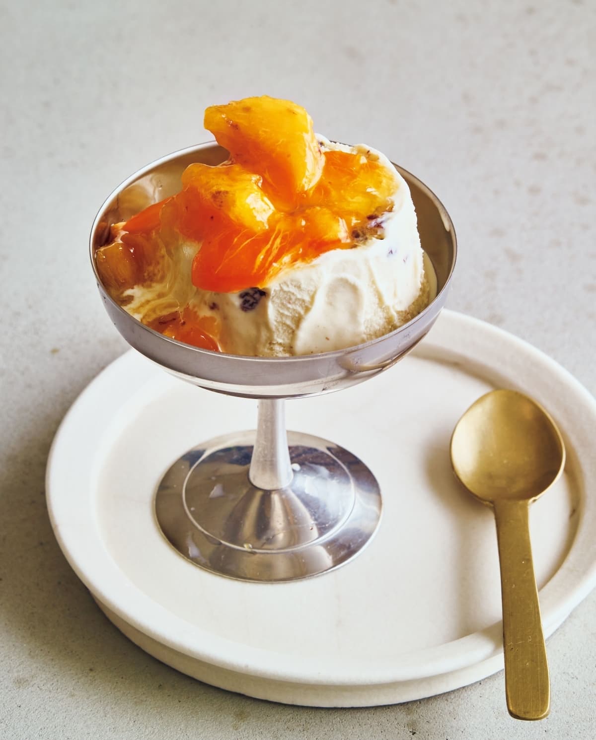 柿は皮をむいて種があれば除き、食べやすい大きさにつぶす。アイスクリームを器に盛り、柿をのせる。
