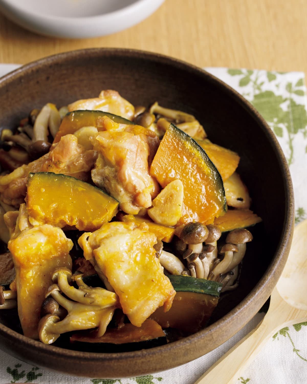 フライパンにサラダ油大さじ1/2を中火で熱し、鶏肉を皮目を下にして並べ入れ、1分焼く。返してにんにくを加え、さらに1分焼く。かぼちゃ、しめじ、煮汁を加え、ときどき混ぜながら7~8分煮る。火を止めてバター20gを加え、ひと混ぜする。