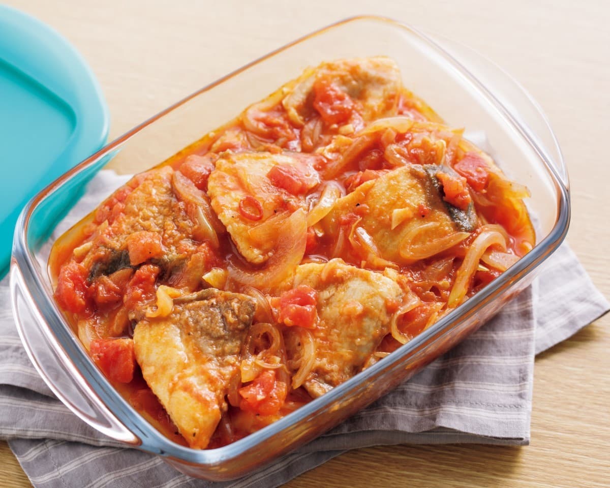 脂ののったぶりをにんにくとともにこくのあるトマト煮にアレンジ。煮汁もパスタや炒めものの調味料として使えます。
