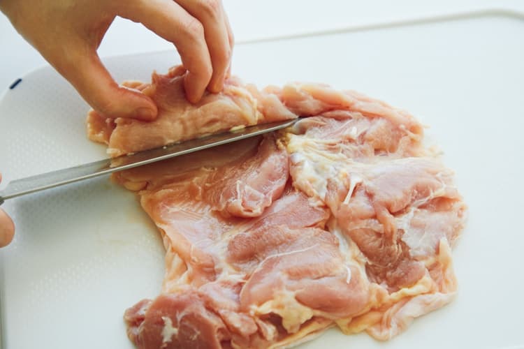 キャベツはしんを取り、一口大のざく切りにする。にんにくは横に薄切りにし、しんを取る。鶏肉は余分な脂肪や筋を取り除き、厚い部分を包丁でそいで開いて厚みを均一にし、一口大に切る。塩、こしょう各少々をふり、片栗粉を薄くまぶす。たれの材料を混ぜる。