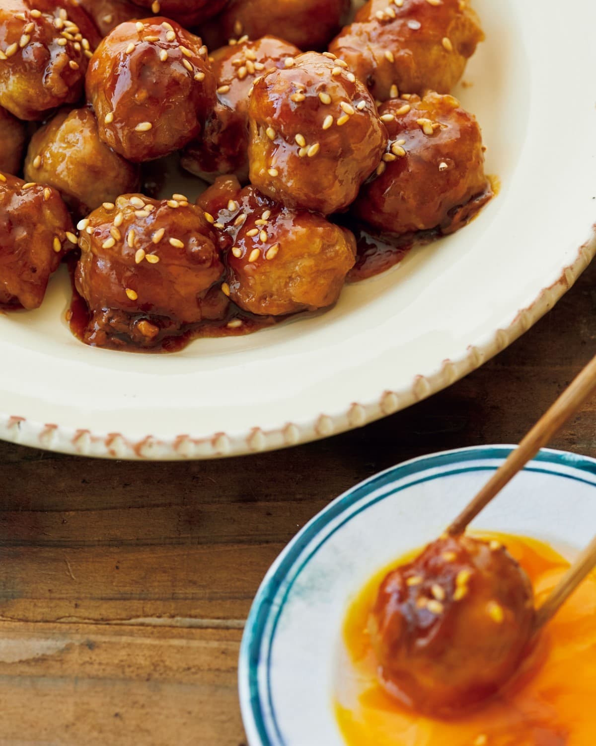 豚肉は塩、こしょう各少々をふり、握るようにして3cm大に丸めて、小麦粉を薄くまぶす。照り焼きだれの材料は混ぜる。