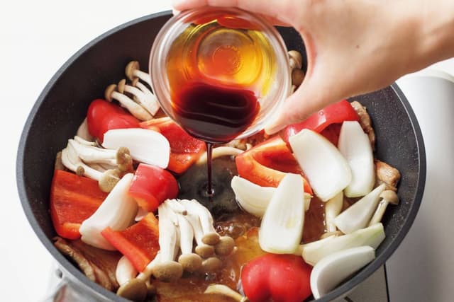 フライパンに豚肉を並べて中火にかけ、塩、こしょうをふって2~3分焼く。焼き色がついたら返して2分ほど焼き、ペーパータオルで余分な脂を拭き取る。パプリカ、玉ねぎ、しめじを加え、Aを加えて強火で煮立て、ふたをして弱めの中火で5~6分煮る。
