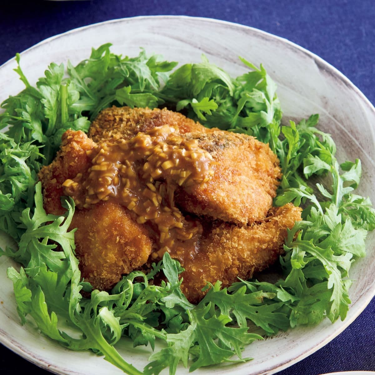 直径20cmのフライパンにサラダ油を高さ2cmくらいまで入れて中温(※)に熱し、ぶりを入れて、ときどき返しながら3分ほど揚げて油をきる。春菊とともに器に盛り、ねぎみそだれをかける。