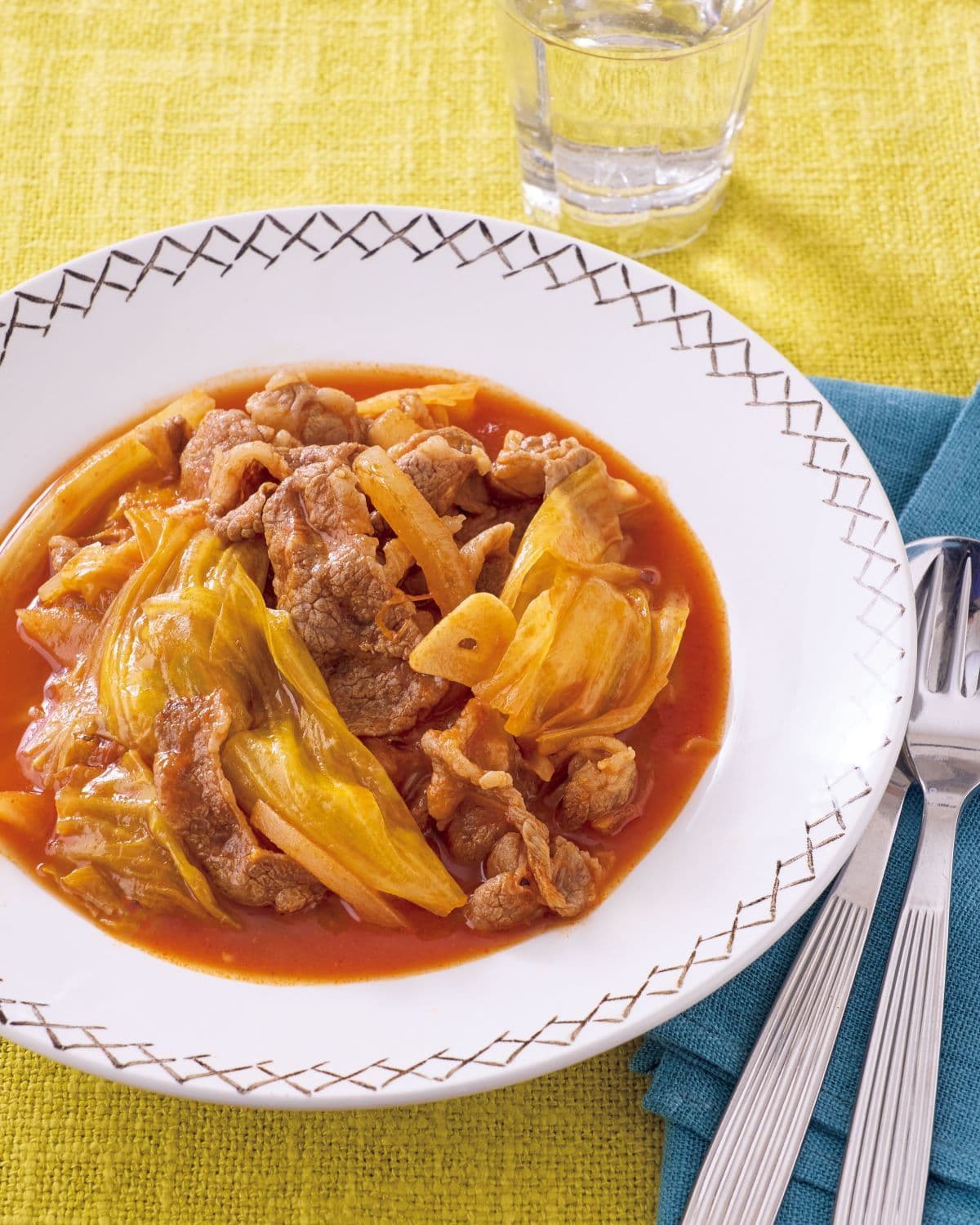 フライパンにオリーブオイル大さじ1/2を強めの中火で熱し、玉ねぎを入れて透き通るまで炒めたら、牛肉、にんにくを加えてさらに炒める。肉の色が半分くらい変わったら、煮汁の材料を順に加え、さらにキャベツを加える。煮立ったらふたをして弱火にし、途中一度混ぜて10分煮る。