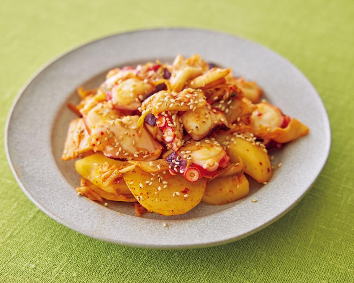 フライパンにごま油を中火で熱し、じゃがいもを並べる。ふたをして弱火にし、5分ほど蒸し焼きにする。ふたを取り、たこ、キムチを加えて中火で炒め合わせ、しょうゆで調味する。器に盛り、白いりごまをふる。