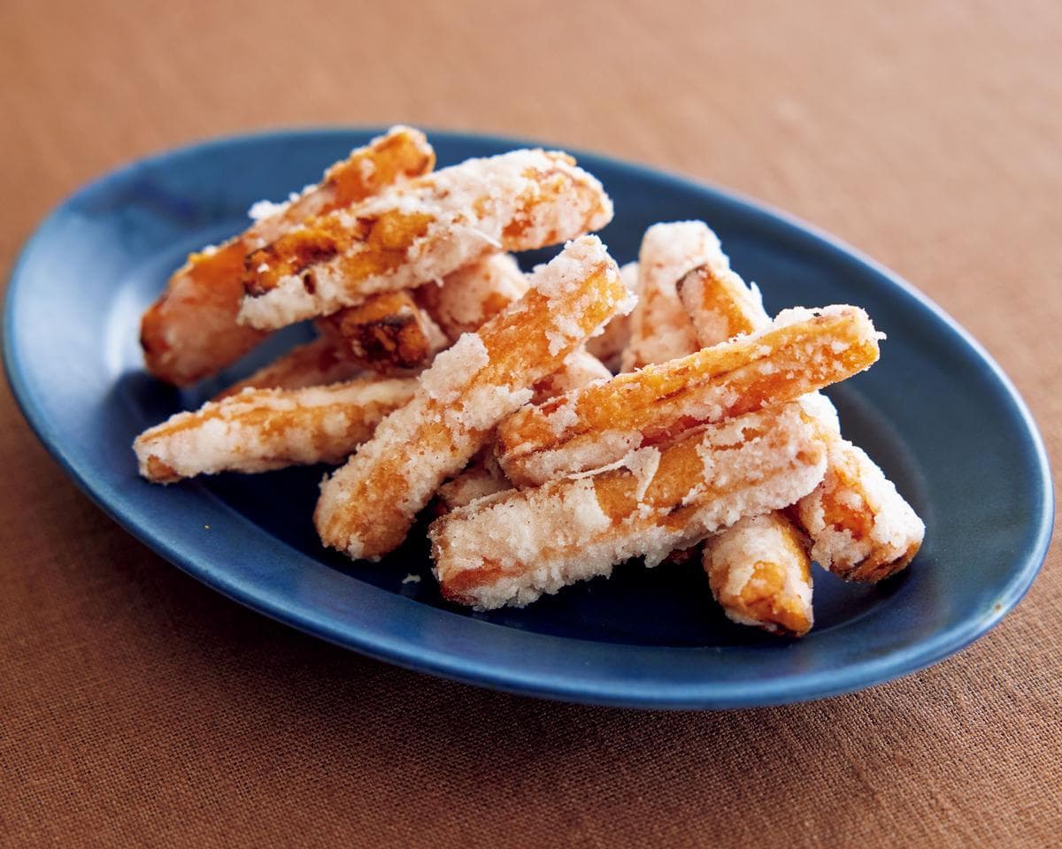 【1】のポリ袋に小麦粉大さじ1と1/2を加えて袋の上からもみ混ぜる。にんじんを片栗粉適宜を入れたバットなどに取り出して全体に薄くまぶす。フライパンにサラダ油を高さ1cmくらいまで入れて中温(※)に熱し、にんじんを返しながら2分ほど揚げて油をきる。