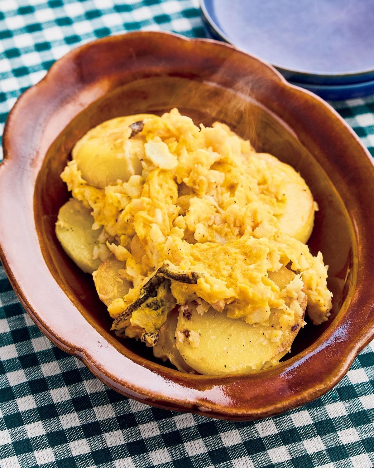 フライパンにオリーブオイル大さじ1を中火で熱してじゃがいもを並べ、ふたをして3分焼く。返して再びふたをし、1分30秒焼く。じゃがいもを奥に寄せ、手前にたらを並べる。両面を1分ずつ焼き、皮ごと木べらなどでほぐして全体を炒め合わせ、塩小さじ1/2、粗びき黒こしょうをふる。卵液を回し入れて大きく混ぜ、卵が固まったら器に盛る。