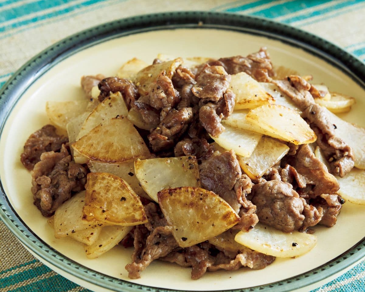 フライパンにサラダ油小さじ1を中火で熱し、大根を広げ入れる。そのまま2分ほど焼いてから3分ほど炒める。表面が透き通ったら大根を端に寄せ、あいたところにサラダ油小さじ1をたして、【1】の牛肉を加えて炒める。肉の色が変わったら塩小さじ1/2、粗びき黒こしょうを加え、全体を炒め合わせる。
