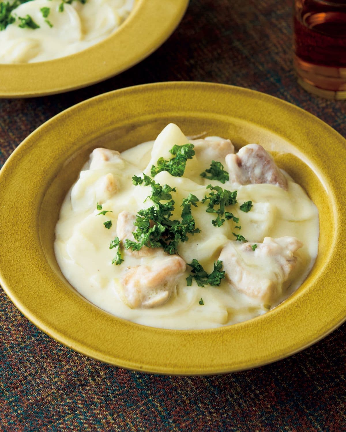 フライパンにオリーブオイルを中火で熱し、鶏肉を皮目を下にして並べ、2分焼く。玉ねぎを加えて2分炒め、小麦粉を加えて粉っぽさがなくなるまで炒める。長いも、牛乳、塩、こしょうを加えて混ぜ、強火にする。煮立ったら弱めの中火にし、ときどき混ぜながら8分煮る。器に盛り、パセリをふる。