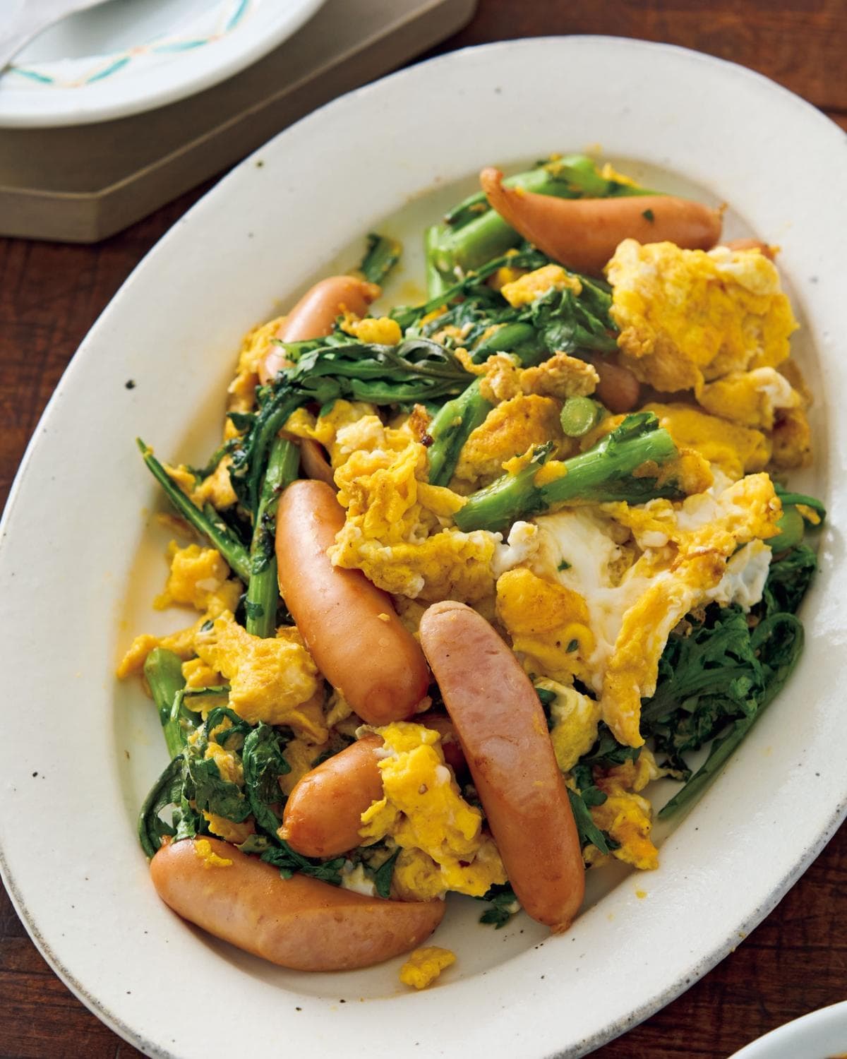ソーセージと春菊を、香りのいいごま油で炒めて卵でふんわりまとめます。