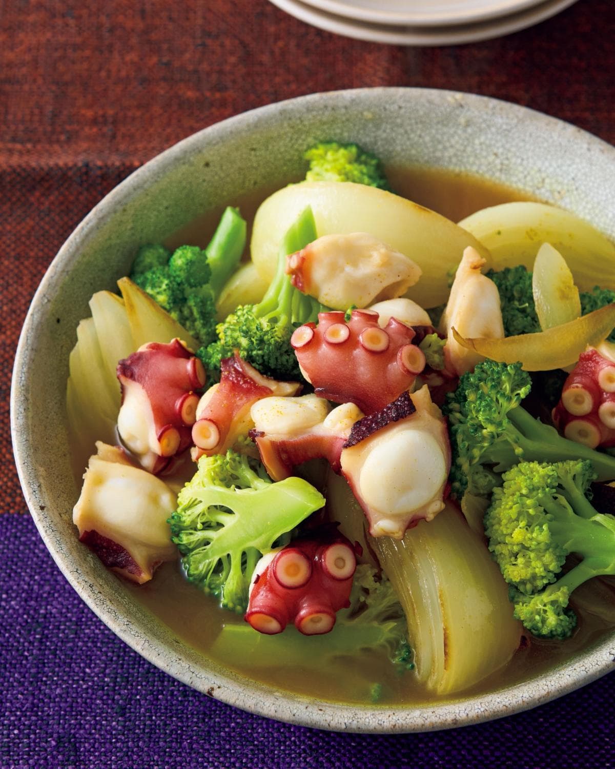 フライパンにサラダ油小さじ2を中火で熱し、玉ねぎを並べ入れる。焼きつける面を変えながら1~2分焼き、かるく焼き色がついたらたこを加えて炒め合わせる。煮汁を加えて2~3分煮てブロッコリーを加え、ふたをして5~6分煮る。仕上げにカレー粉を加え、大きく混ぜてなじませる。