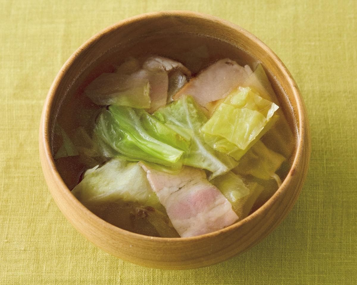 鍋にサラダ油小さじ2を中火で熱し、キャベツを2~3分炒める。ベーコン、だし汁、塩小さじ1/4、しょうゆ、酒各小さじ1を加え、2~3分煮て塩少々で味をととのえる。