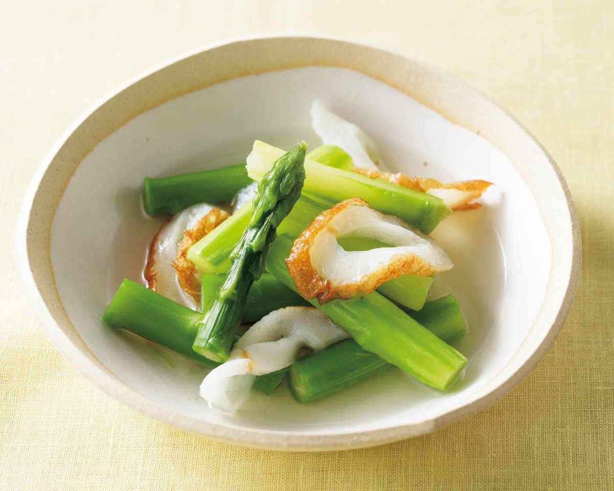 アスパラは根元を1cmほど切り落とし、下から3~4cmまでピーラーで皮をむき、長さ5cmに切る。ちくわは幅2~3mmの斜め切りにする。