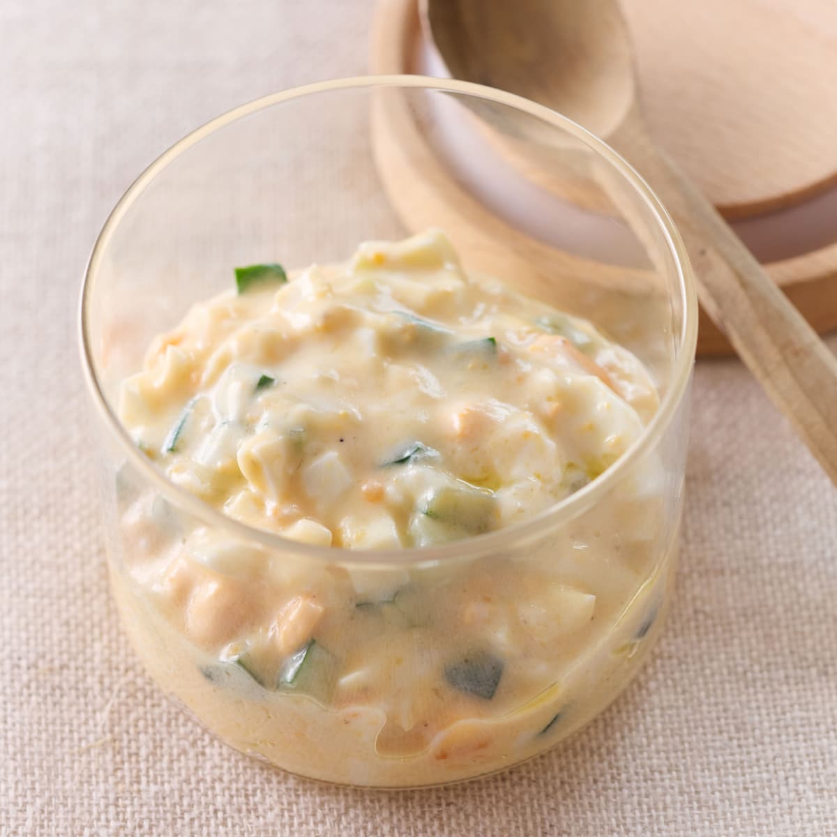 きゅうりは5㎜角に切る。塩少々(分量外)をふってかるくもみ、約5分おいたら、キッチンペーパーで水けを絞る。ゆで卵は粗く刻む。