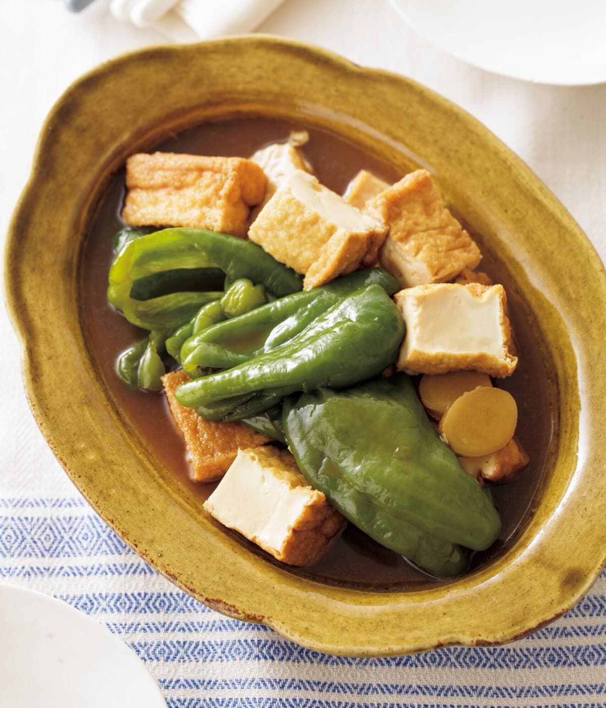 手でつぶしたピーマンに厚揚げのこくが溶け出た煮汁がしっかりしみ込みます。