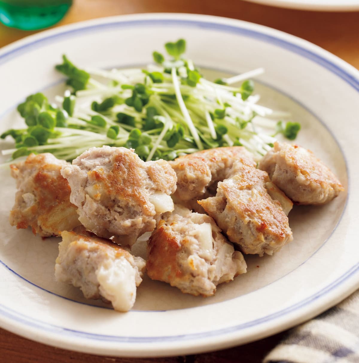 フライパンにサラダ油を入れて広げ、【1】の肉だねを1/14~1/12量ずつちぎり入れる。ふたをして強めの中火にかけ、3~4分焼く。ふたを取って返し、そのまま2~3分焼く。器に盛り、貝割れ菜を添える。