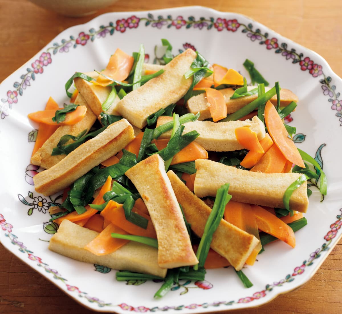 フライパンにサラダ油を中火で熱し、高野豆腐、にんじんを入れて強めの中火で炒める。にんじんがしんなりしてきたらAを回し入れ、にらを加えてさっと炒め合わせる。