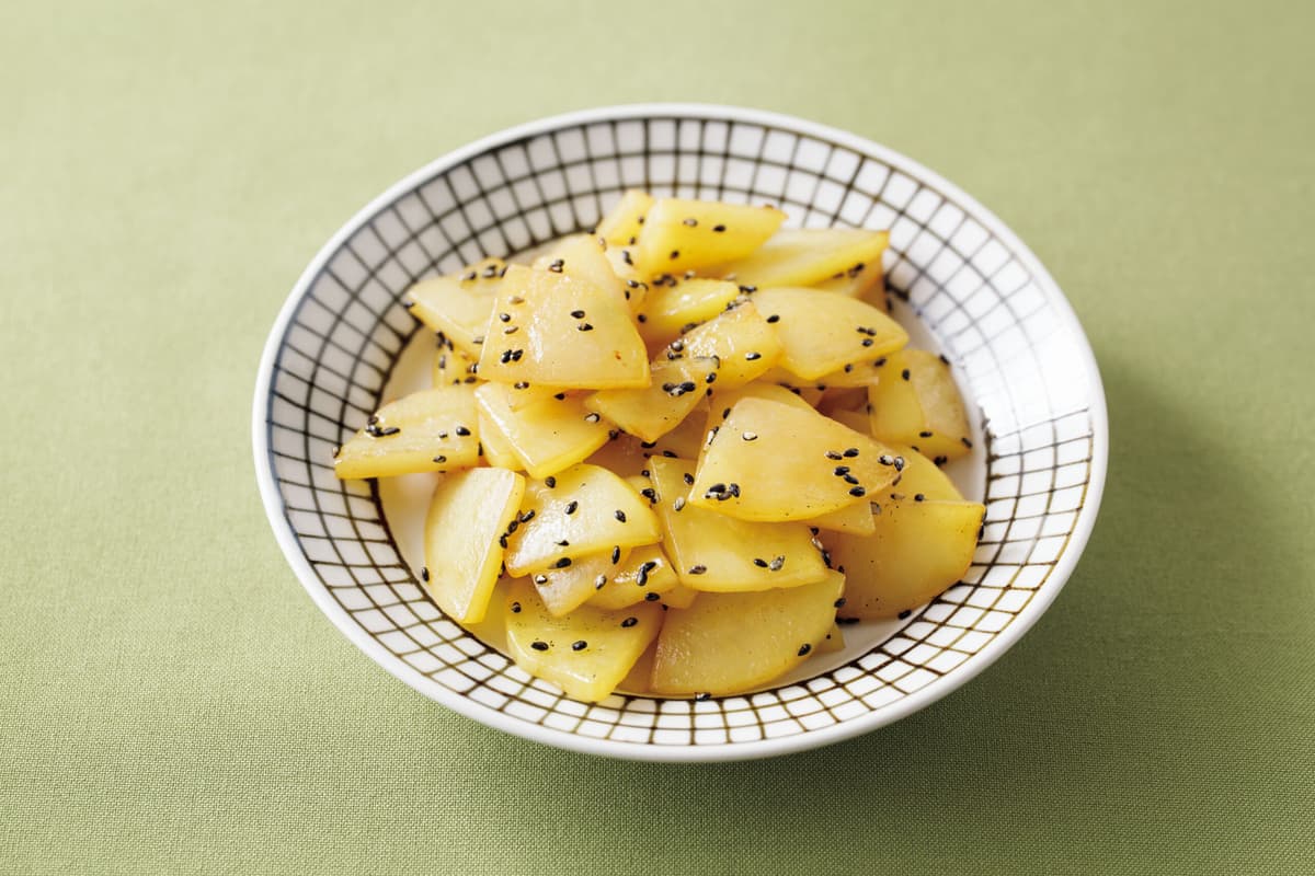 じゃがいもは皮をむき、幅2~3mmのいちょう切りにする。さっと水にさらし、ざるに上げて水けをきる。